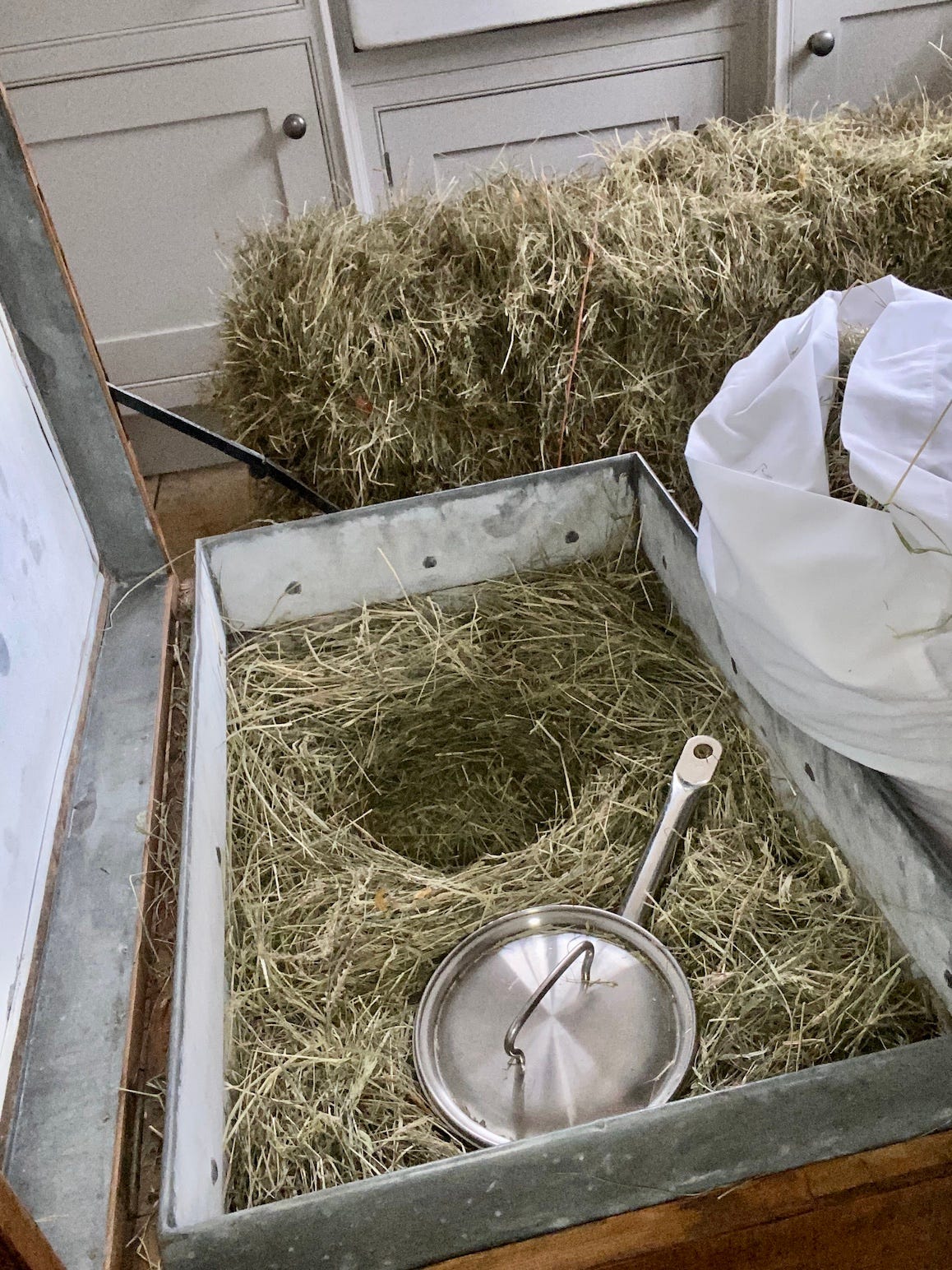 The first thing I noticed was that there was a surprising amount of hay in a compact bale particularly given that it only cost £7.25. Once you've prize a few handfuls from the mass, the uniform block quickly descends into a chaotic conglomeration of strands, not a similar to Boris Johnson's barnet. Secondly, is the scent. Hay has a wonderful mellow aroma like freshly mown grass tempered with a generous splash of cream to tone down its sharpness. Surrounded by the sweet smell of hay, the box filling was swiftly, if untidily, accomplished (you can see a short reel on Instagram of me doing this). The kitchen looked more like a stable than food prep area when I'd finished, but with the box complete including two indentations for pans I was ready to start cooking. As the recipes below indicate the initial cooking required was minimal. Once the saucepans were safely tucked away in their nests the gentle cooking process continued without any further interference from myself and no telltale aromas emitted from the former coffee table